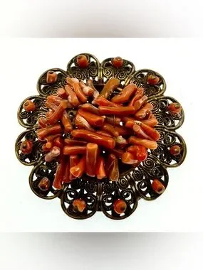 Beautiful vintage brooch featuring a rich cluster of coral branch pieces set atop an ornate antiqued gold-tone filigree base. The dimensional, domed design gives this piece wonderful texture and depth, making it a true standout accessory. Vintage mid-century piece (approx. 1940s–1960s).