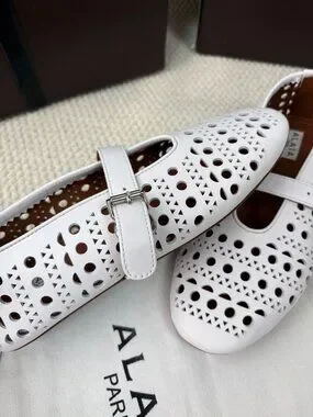 Elevate your style with these chic ALAÏA Mary Jane flats. Crafted from high-quality leather, the white upper features intricate perforations for a breathable and fashionable look. The classic buckle strap adds a touch of elegance, making them perfect for both casual outings and semi-formal events.