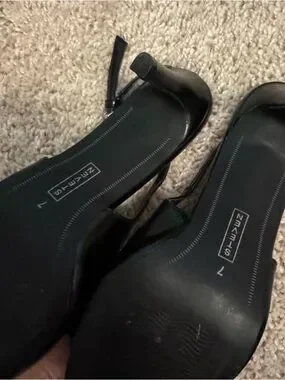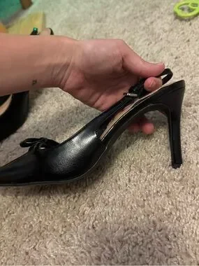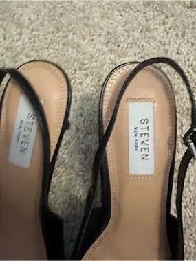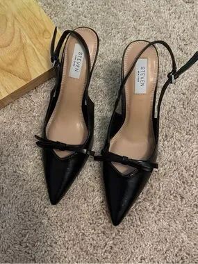 STEVE by Steve Madden black pointed slingback pumps with a delicate bow detail. Sleek leather-look upper and adjustable ankle strap for a secure fit. Versatile black color that pairs well with dresses or workwear.