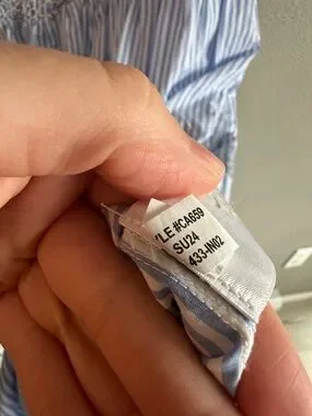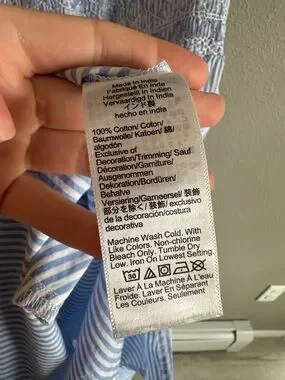 Smocked bodice with adjustable tie shoulder straps. Lightweight pinstripe fabric flows to a maxi length. Breezy silhouette for casual warm days. Clean, classic design that layers easily. Made of 100% cotton material. Has pockets.