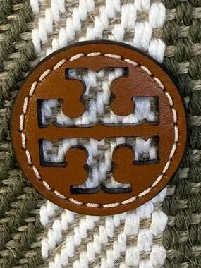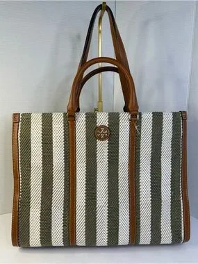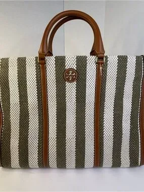 Tory Burch striped canvas tote in “groove” green and white. Beautiful cognac color leather handles and trim with stitched detailing. Open top with versatile (dual straps) carry options-large interior pocket. Hand strap drop approximately 4.5”, shoulder strap drop approximately 9”. Excellent (like new) condition, from smoke free home. View all photos.See last photo for approximate measurements.Casual yet refined look and roomy for daily use.