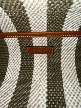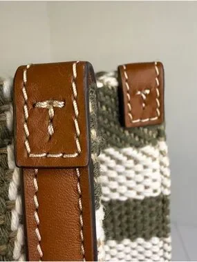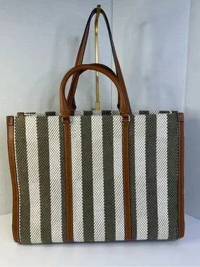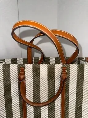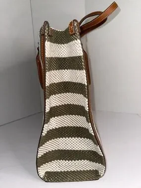 Tory Burch Blake Grove Green & White Striped Canvas Tote Cognac Leather Trim