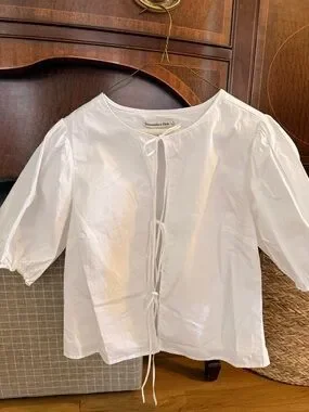 Lightweight white blouse with tie-front closures. Short puff sleeves with elastic cuffs. Round neckline. Soft cotton fabric. Clean, classic style.