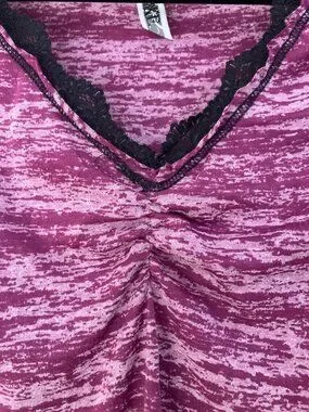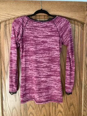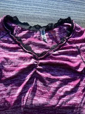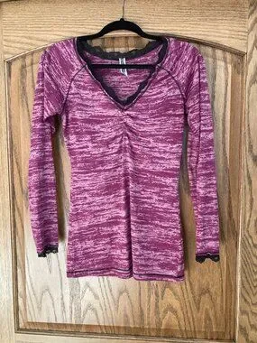 Long-Sleeved women's top in several shades of purple, with black lace trip on the collar and sleeves. Semi-sheer, meant for layering. I typically wore a cami underneath and a lacy vest/flair over. BKE brand, originally purchased at The Buckle. Women's size L, although this is snug fitted.