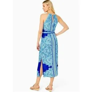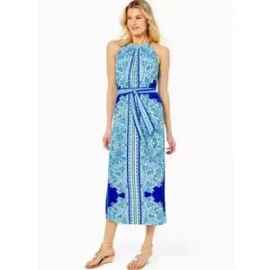 Sleeveless halter neckline with a fitted waist tie. Vibrant paisley and stripe print in blue and white. Floor-length silhouette with side slit. Lightweight, flowy fabric for warm-weather wear.