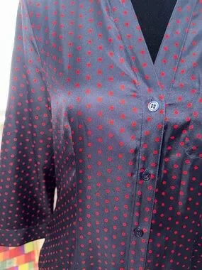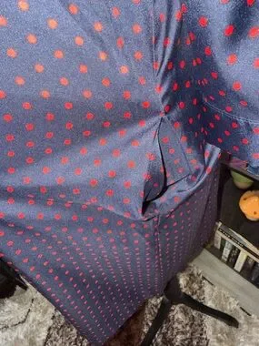 Navy blue midi dress with all-over small pink polka dots. Button-front V-neck design. Three-quarter sleeves and subtle waist shaping. Lightweight, drapey fabric for easy wear. Feminine and versatile for day or evening.