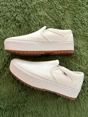 Platform slip-on sneakers by Vans. Canvas upper in white with easy on-and-off design. Elevated cushioned platform for added height and comfort. Gum rubber outsole offers traction and contrast. Subtle Vans logo tab on the side. NWOT