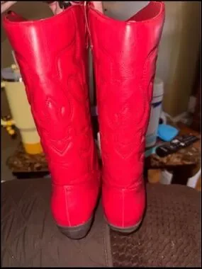 Bold red cowboy-style heeled boots by Soda. Stitched western embroidery on the shaft. Pointed toe and stacked heel. Smooth faux leather finish. Easy pull tabs at the top.
