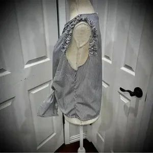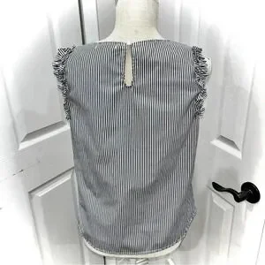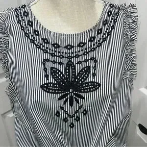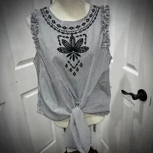 Description: such a cute, embroidered, sleeveless blouse with ruffles at the shoulder, ties at waist for a flattering,slimming look. Fabric print is black and white striped. Keyhole button on back. Very cute!
