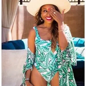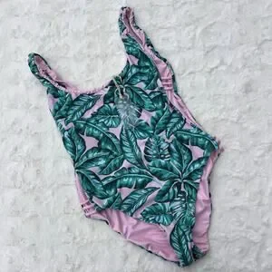 tropical swimsuit, palm print, resort wear, vacation outfit, cutout swimsuit, beachwear, summer swim, pink green swimsuit, island vibe, poolside look