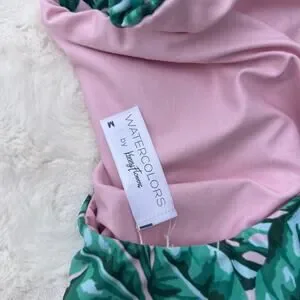 Watercolors by Kenny Flowers one piece in women’s size M. Vibrant tropical leaf print with a flattering high-cut leg and side cutout details for a chic, resort-ready look.