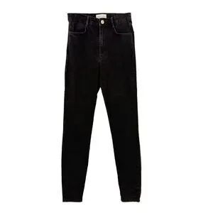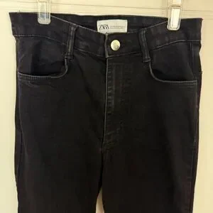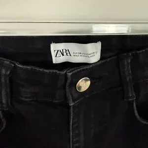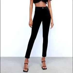 Dress up your wardrobe with these sleek ZARA High Rise Jegging Denim Skinny Jeans in a versatile black hue. Designed to flatter with a contemporary high-rise fit, these stretchy pants offer both style and comfort. The classic 4-pocket configuration keeps essentials close at hand, while the zip and button closure ensures a secure and smooth silhouette. Crafted for the modern woman, these jeans feature a dark fabric wash for a sophisticated look that transitions effortlessly from day to night. The size 6 jeans have an inseam of 28.5 inches and a rise of 11 inches, providing a regular fit that complements your shape without sacrificing comfort. Care is a breeze with machine washable convenience. Embrace the perfect blend of fashion and function with these essential jeggings.