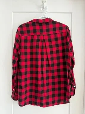 Casual red and black plaid shirt with buttons.