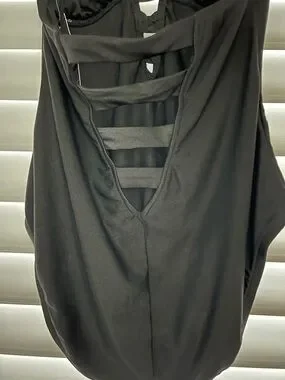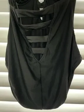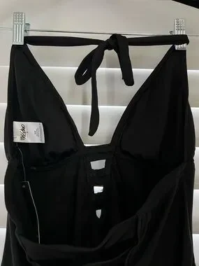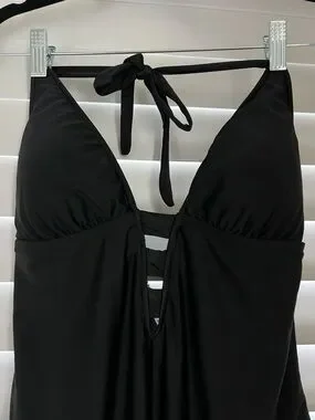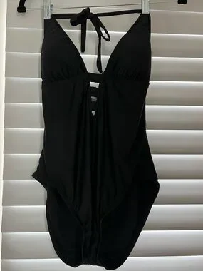 New with tags. Never worn! Sleek black halter one-piece designed for a flattering fit. Adjustable tie-neck and soft cups provide support and comfort. Subtle front and back ladder detail adds a stylish focal point. Smooth stretch fabric for easy wear and a timeless look.