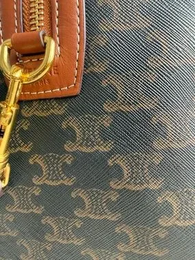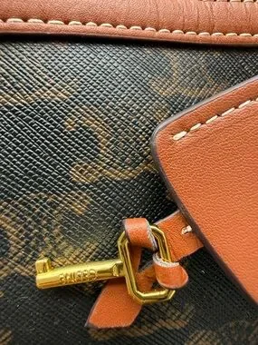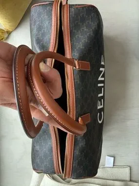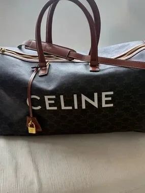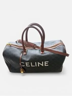Classic duffel silhouette in black logo canvas. Brown leather handles, trim, and detachable strap. Bold CELINE logo on front. Gold-tone hardware and zip closure. Structured yet roomy for travel.