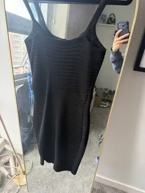 Sleek black ribbed bodycon dress with thin straps. Flattering fitted silhouette that sculpts the waist.