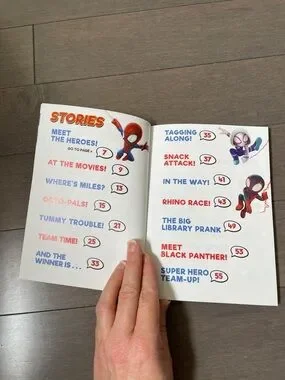 Disney Junior Marvel kids comic-style book featuring Spidey and friends. Bold, colorful artwork with action poses. Playful, kid-friendly design captures adventure.