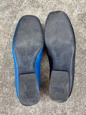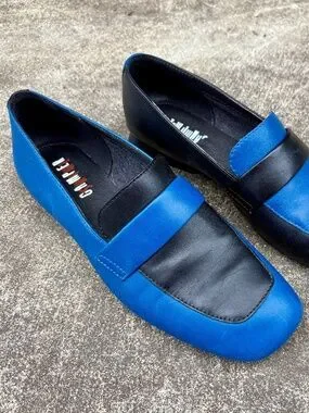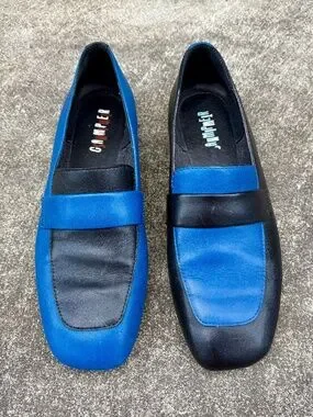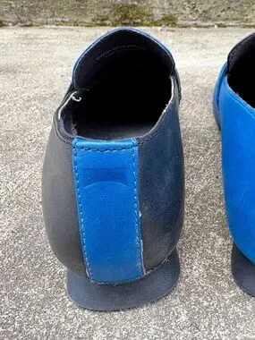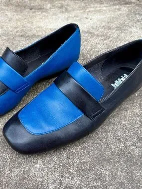 Camper Twins loafers in black and blue leather. Intentionally mismatched—they’re fraternal twins, not identical! Size 39 but fit on the smaller/slimmer side. Very good used condition.