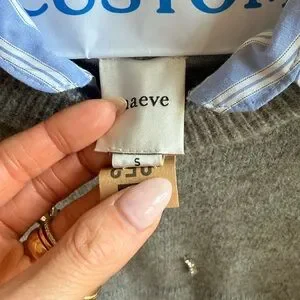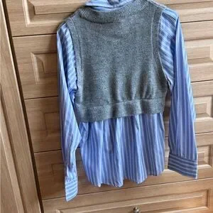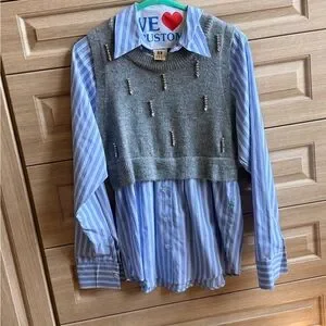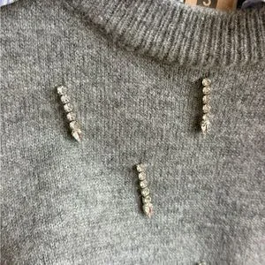 Cropped knit vest in soft gray with decorative bead accents. Sleeveless layer that pairs over shirts. Clean neckline and ribbed hem for structure.
