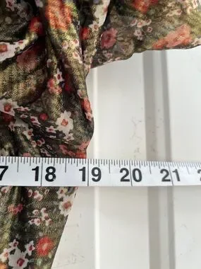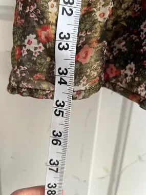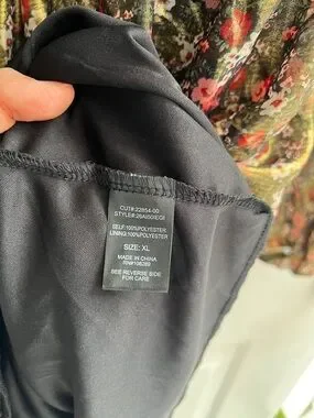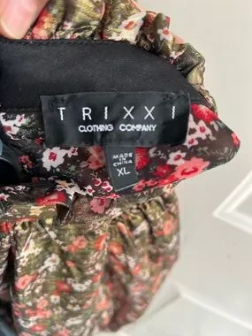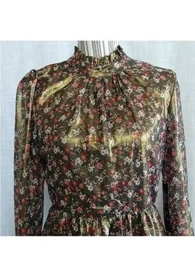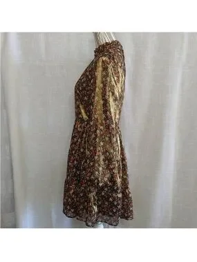 Shimmery metallic floral mini dress by Trixxi. Long sleeves with a gathered waist. Lightweight, feminine silhouette. Elegant gold sheen with floral print details.