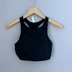 Sleek black sports bra with a fitted design. Ideal for active wear.