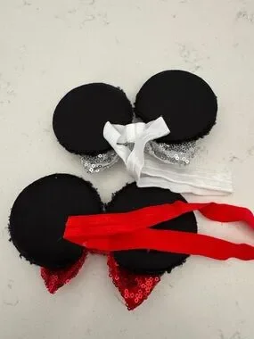 Two plush black Minnie ear headbands. One features a red sequin bow. The other features a silver sequin bow. Elastic bands for easy wear. Cute Disney-inspired accessory.