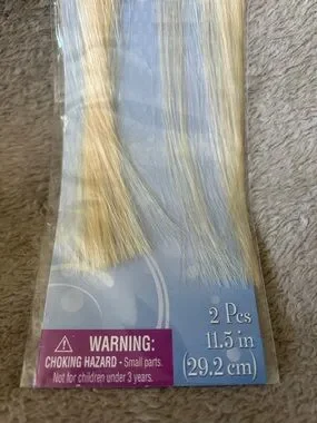 Disney-branded blonde clip-in hair extensions. Features two long blonde pieces topped with silver bow accents. Easy to attach for dress-up or costumes. Perfect for adding instant princess style.