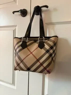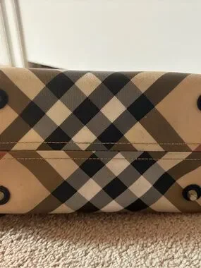 Stylish beige Burberry plaid tote with black leather straps. Features a structured silhouette and secure top opening. Neutral beige plaid complements everyday and work outfits. Comfortable shoulder straps for easy carry.