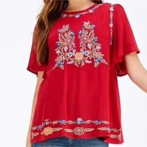 Entro embroidered blouse, Entro floral red top, Entro boho blouse size L, Entro short sleeve blouse, Entro rayon embroidered top, Entro festival blouse, Entro chic boho top, Entro casual embroidered blouse, Entro red floral boho blouse, Entro embroidered tunic style top
