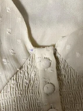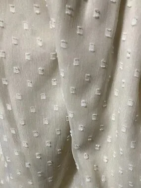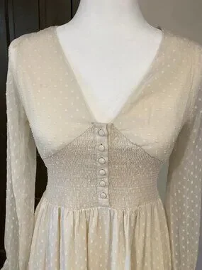 Altura Dress by Patrons of Peace. This beautiful, full length dress features a delicate, Swiss dot design, V-neckline, long, sheer puff sleeves with elasticated cuffs, and a smocked bodice with buttons and high waist. Made in India. Boho, Cottagecore, Milkmaid, Peasant style.