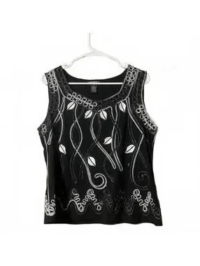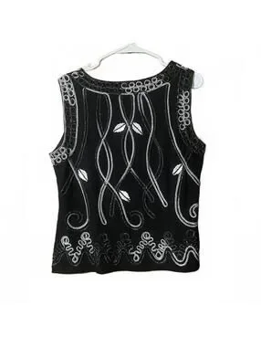 Stylish black sleeveless top from Lauren Michelle featuring intricate white and silver embroidery. Perfect for casual outings or dressy occasions. Comfortable blend of polyester, rayon, and spandex for a flattering fit. A versatile addition to your wardrobe!
