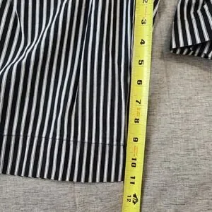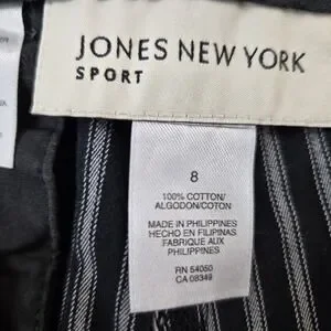 The Jones New York Sport Women's Long Shorts in Bermuda style are perfect for casual occasions with a classic black and white striped pattern. Made of cotton twill, these shorts feature a flat front and 11" inseam, offering a comfortable and stylish fit for women in size 8 with a 31" waist. The mid-rise and regular fit provide a flattering silhouette, while the Bermuda style adds a sporty touch suitable for summer, fall, and spring seasons. Perfect for everyday wear, these shorts are a versatile addition to any wardrobe. BA023
