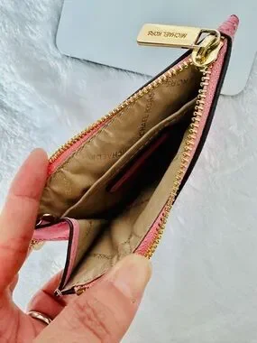 Compact Saffiano leather card holder with secure zip pocket. Features gold-tone Michael Kors logo and matching keyring. Holds cards and small essentials neatly. Stylish accessory for daily use.
