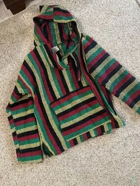 Classic striped Baja-style hoodie. Hooded pullover with kangaroo pocket. Bold red, green, black and gold stripes. Soft woven texture. Casual, relaxed fit for everyday wear.