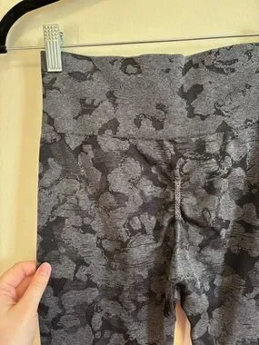 High-waist seamless leggings in gray camo for a flattering, secure fit. Moisture-wicking fabric keeps you dry during workouts. Four-way stretch offers full mobility and recovery. Subtle logo detail for a sporty finish. Perfect for gym sessions or everyday athleisure wear.
