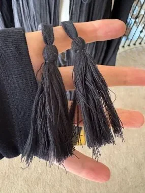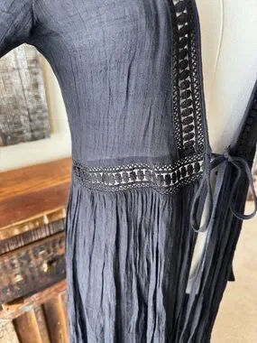 Flowing black maxi coverup with tie-front closure. Lightweight breathable fabric offers easy layering. Bell sleeves add a stylish, relaxed vibe. Front slit with crochet detailing shows swimwear underneath. Great for resortwear, vacay or a day at the pool!