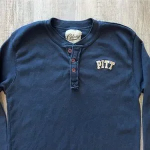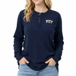 pitt panthers, university of pittsburgh, pitt shirt, pitt thermal, pitt henley, college apparel, ncaa gear, university gear, varsity style, game day outfit, navy blue shirt, thermal henley, waffle knit top, long sleeve henley, colony dry goods, mens henley, womens oversized henley, unisex style, cozy tops, fall winter layers, casual streetwear