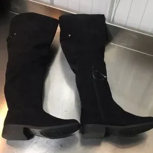 Black over-the-knee boots. Suede-like finish with low block heel. Side buckle detail. Sleek and versatile style.