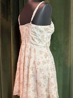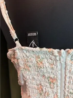 Smocked bodice with delicate orange and green floral print. Adjustable spaghetti straps. Back zipper closure. Soft, feminine summer piece.