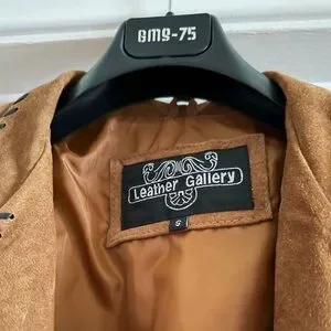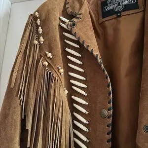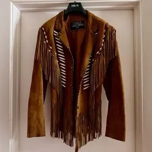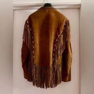 Offered to a new home is this beautiful vintage brown suede jacket by Leather Gallery, made of genuine leather and featuring fringe, faux hairpipe bone beads and detailed buttons. Labeled size S but fits like a medium; see measurements. No missing fringe, no stains or odors. Perfect for a Boho/Western vibe or for someone who appreciates Native American style. From my vintage collection, never worn. Perfect for festival season!