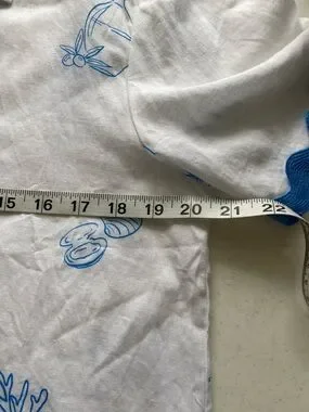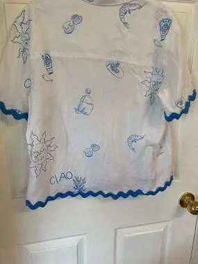 Lightweight linen blend button-front top with short sleeves. White fabric printed with playful blue seaside illustrations. Blue rickrack trim on sleeves and hem adds charm. Casual, breezy silhouette for warm days.