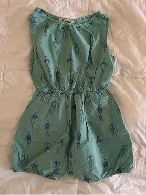 Lightweight mint green romper with navy printed artists. Playful, artistic print ideal for casual wear. Size 6-7 (fits true to size)