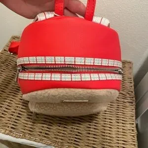 Cute Sherpa lining on front the main color of the bag looks like an orange coral mix