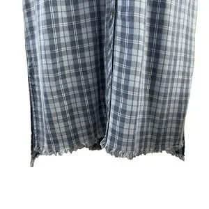Details: Button front shirt dress silhouette, collared neckline, short cap sleeves, allover blue plaid pattern, two chest patch pockets, two side seam pockets, midi length, raw fringed hem, woven lyocell fabric, unlined construction, casual relaxed fit.
