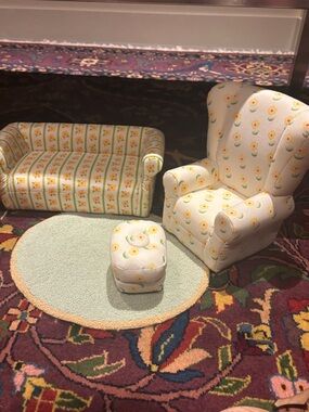 Angelina Ballerina Living room set! The tables are a bit broken. One is Missing a leg but will stand and the other has a leg that will pop out just needs to be glued! Otherwise perfect! Comes with box!