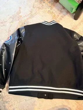 Black varsity jacket featuring Chicago Cubs patches. Contrasting white striped ribbing and pocket trim for a classic look. Leather-look black sleeves with stud details add edge. Team-branded graphics provide bold, authentic style.