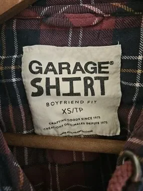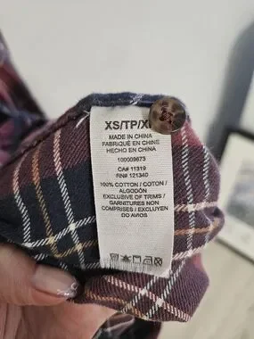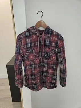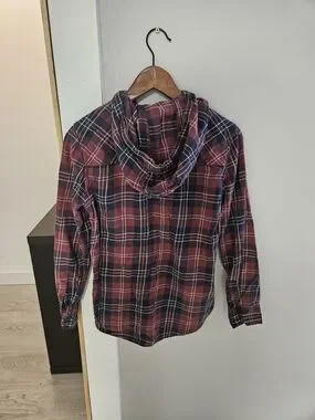 Casual hooded button-up shirt in red and navy plaid. Front chest pockets and drawstring hood. 100% cotton. Great for layering.