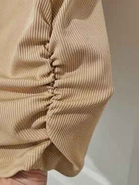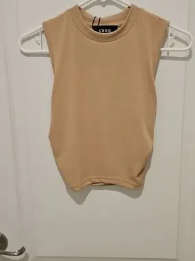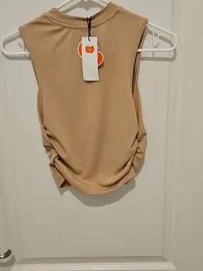 Sleeveless ribbed crop top. High crew neckline. Ruching on sides.Soft stretch fabric. Clean minimalist design. Easy to style for day or night.