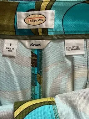 Talbots cropped pants with bold swirl print. Bright turquoise base with olive and brown accents. Stretch cotton blend for comfort. Stylish, retro-inspired look.