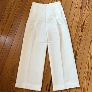 Crisp white wide-leg pants from Zara. High waist with tailored front pleats. Clean lines and wide hem. Versatile style for day or evening.